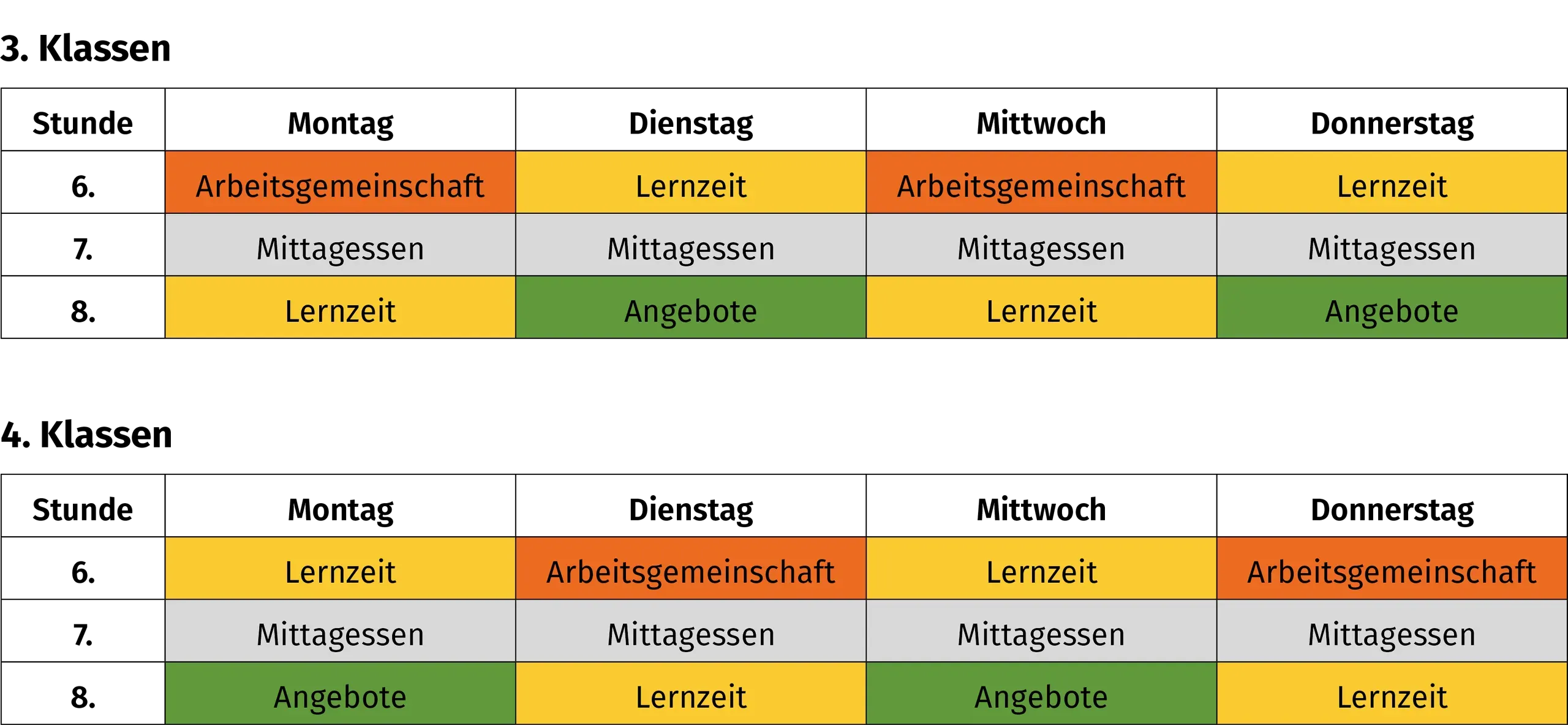 Angeboten werden Zeichnen, Puzzeln, Outdoor, Lesen in der Schülerbibliothek, Schreibwerkstatt, Schach, Gesellschaftsspiele, Konstruieren & Bauen, Erste Hilfe für Kinder, Sportspiele, Entspannung, Freundschaftsbänder knüpfen etc. Die Angebote ermöglichen den Kindern, sich auszuprobieren, neue Interessen zu entdecken und in kleinen Gruppen soziale Erfahrungen zu sammeln. Die Angebotszeiten der beiden Jahrgänge ergeben sich aus folgender Übersicht: