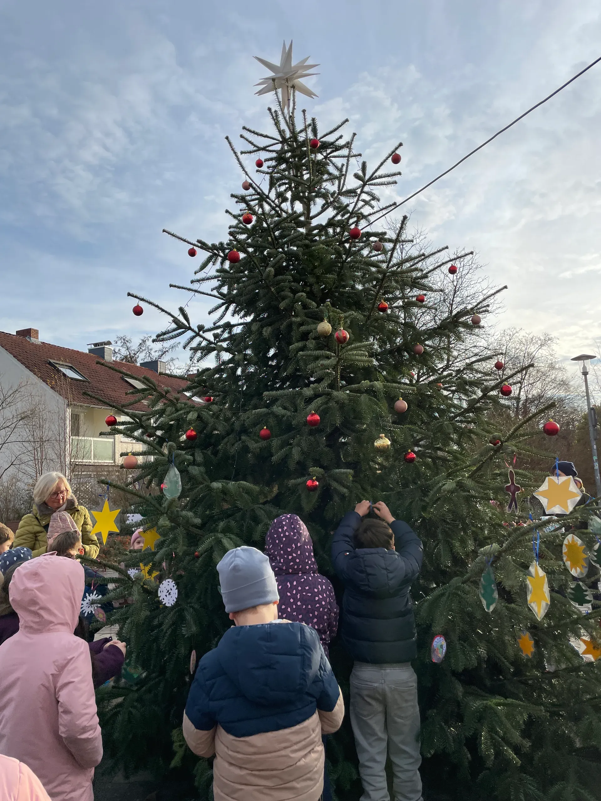 Unsere ersten Klassen schmücken den Weihnachtsbaum in der Zugbrückenstraße.